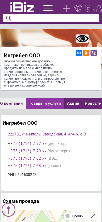 Название / ЗаголовокИнгрибел ООО - Вкусо-ароматические добавки, комплексные пищевые добавки. Продукты из мяса и мяса птицы копчено-вареные, копчено-запеченые. Изделия колбасно-вареные, варено-копченые, полукопчёные, сыровяленые, сырокопчёные. Полуфабрикаты. Зельцы, ливерные и кровяные колб. 222750, Фаниполь, , Заводская, 41А/4-6, к. 8
