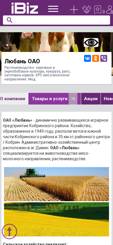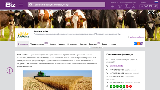 Название / Заголовок | Любань ОАО - Растениеводство: зерновые и зернобобовые культуры, кукуруза, рапс, заготовка кормов. КРС мясо-молочное направление. Мед.. 225876, , Дивин аг., Ленина, 81 |
