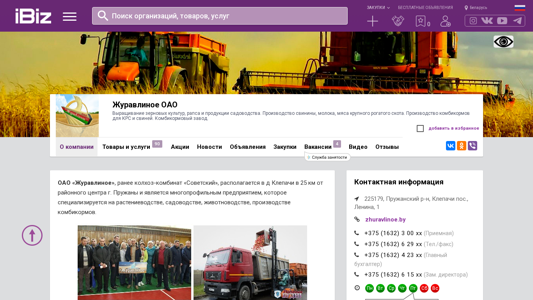 | AI-анализ | --- The web project "Журавлиное ОАО" is a multi-profile Belarusian farm located in Klepachi, 25 km from Pruzhany. The company specializes in crop farming, horticulture, animal husbandry, and the production of feed for livestock. Their assets include 8 MTFs, livestock farms, a pig farm, a swine complex, a combi corn factory, and a substantial fleet of specialized and agricultural vehicles. "Журавлиное ОАO" produces and sells pork, meat, milk, dairy cattle, grains, feed for livestock, and horticultural products. The company also operates retail stores in the villages of Kozy, Moroke, and Klepachi, as well as in Pruzhany. All products undergo rigorous testing in a specialized laboratory. |