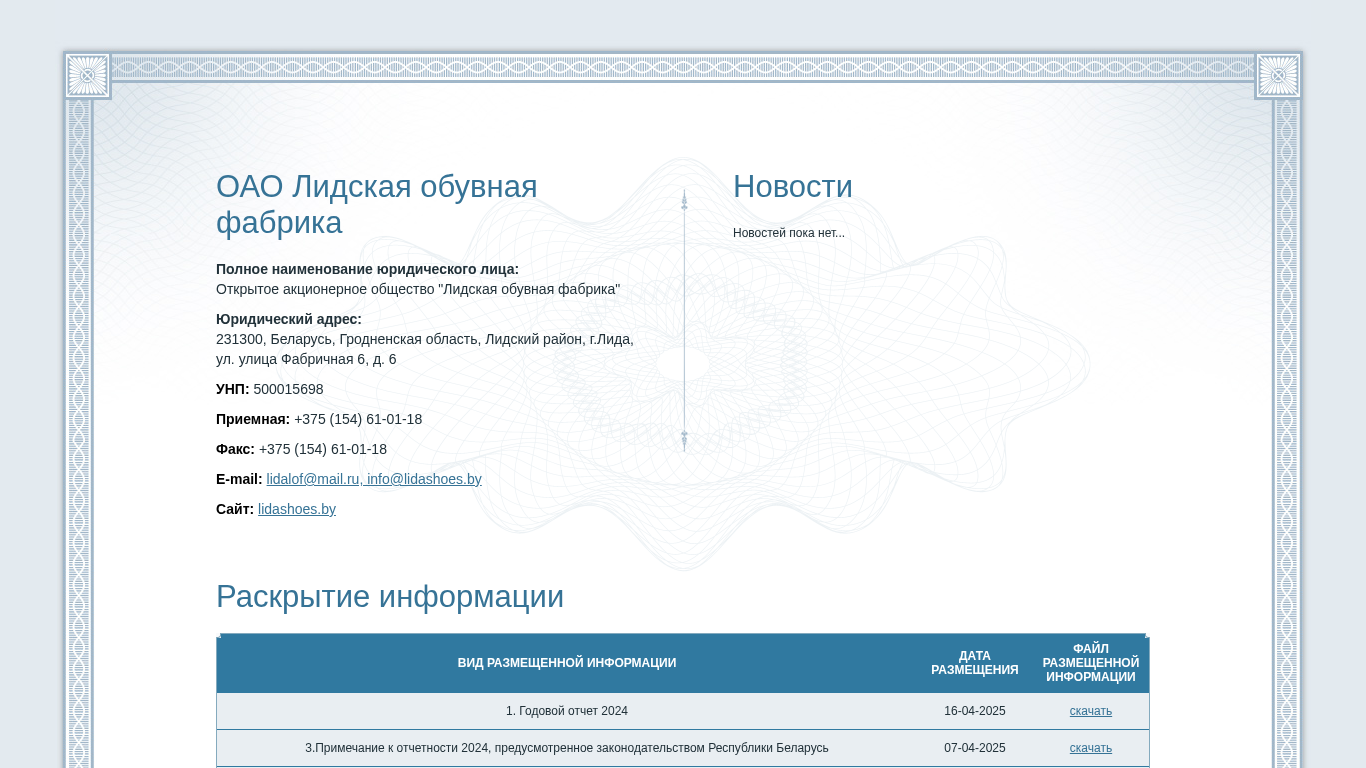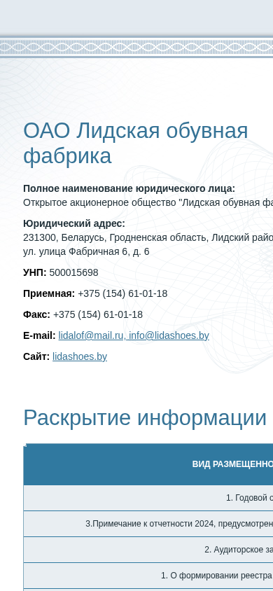 | AI-анализ | --- This online resource represents the official website of Open Joint Stock Company "Lidskaya Obuvnaya Fabrika" (Lidskaya Obuvnaya Fabrika OAO). The website provides access to various financial reports and documents, including annual reports, auditor's reports, and notices regarding the formation of shareholder registers. The reports span the years from 2010 to 2025. Users can download these documents in PDF format by clicking on the corresponding links provided. The website is developed by epfr.by. |