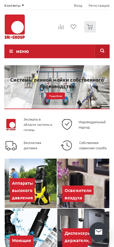 | AI-анализ | --- The web project Sm-gr.by, titled "СМ групп — комплексный подход к гигиене и санитарии" (SM group — comprehensive approach to hygiene and sanitation), is an e-commerce business based in Belarus. It specializes in selling products for professional and household cleaning. The company offers free delivery throughout Belarus and stocks over 3,000 items. Visitors can browse, add items to their cart, and view their cart's total price. The site includes a catalog with various categories such as cleaning equipment, production and service, and household items. The contact information provided is an email address (client@sm-group.by) and phone numbers for sales, customer service, and a call-back service. The site also features a login and registration page. Sm-gr.by offers a wide range of cleaning products, including Karch |