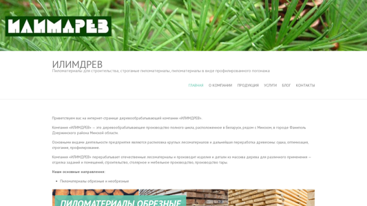 | AI-анализ | This website is an online presence for the Belarusian timber processing company "ИЛИМДРЕВ". The company specializes in the production and sale of various types of sawn timber, including obreznye (obtained by sawing) and stroganie (obtained by planing) timber. These timbers are used for construction purposes, such as beams, rafters, and joists, as well as for the production of packaging materials like pallet boards and boxes. The company also offers a range of other timber products, including massive parquet flooring, flooring for the ground, terrace planks, and construction blocks. The available types of wood include pine, spruce, larch, oak, ash, elm, and birch. The website features a responsive menu with sections on the company, products, and services, as well |