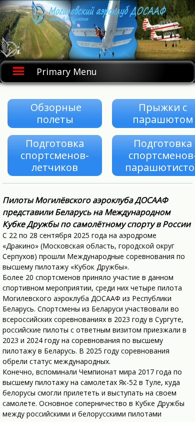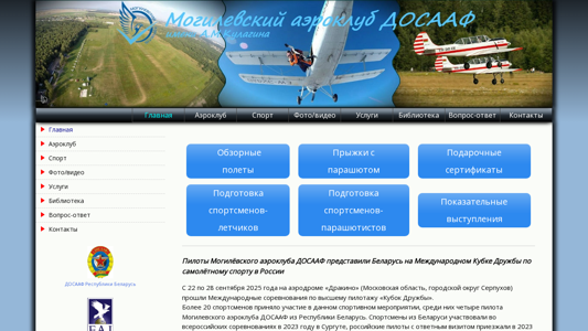 | AI-анализ | ---  The portal is dedicated to the Mogilev Aeroclub DOSAAF named after A.M. Kulagin. Key topics include the aeroclub in Mogilev, sports aviation, and parachute jumping. The website provides information on the history, veterans, and services of the aeroclub, including observational flights, parachute jumping, and podgorovki (training) for pilots, para jumpers, and aviation modelers. The site also features a library and a question-and-answer section. In 2025, the Mogilev Aeroclub DOSAAF represented Belarus in the International Cup of Friendship for glider sports in Russia. The aeroclub has a long history of participation in various aviation sports events, with Russian pilots visiting Belarus for competitions in 2 |