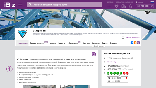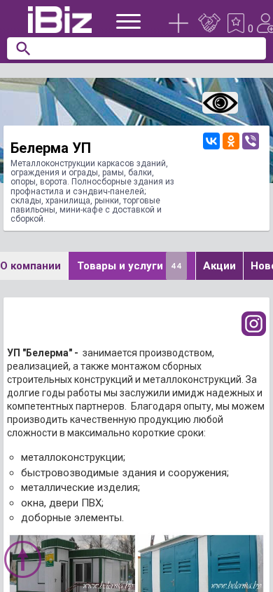 | Название / Заголовок | Белерма УП - Металлоконструкции каркасов зданий, ограждения и ограды, рамы, балки, опоры, ворота. Полносборные здания из профнастила и сэндвич-панелей; склады, хранилища, рынки, торговые павильоны, мини-кафе с доставкой и сборкой.. 222750, Фаниполь, , Заводская, 41 |
