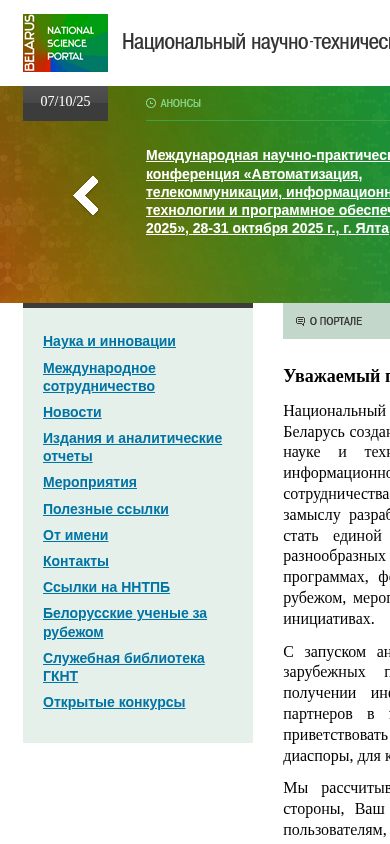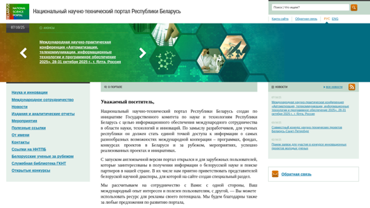 | AI-анализ | The portal National Science and Technology Portal of the Republic of Belarus provides information on various opportunities for international cooperation in science, technology, and innovations. Initiated by the State Committee on Science and Technology of the Republic of Belarus, it aims to be a single point of access for Belarusian scientists to information on programs, grants, project competitions, events, and successful projects and initiatives both in Belarus and abroad. The English version of the portal also caters to international visitors interested in Belarusian science and seeking partners in the country. A dedicated section is available for the Belarusian scientific diaspora. |