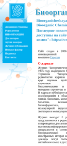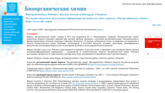 | AI-анализ | url: https://www.rjbc.online The web project "RJBC - Журнал "Биоорганическая химия" (Russian Journal of Bioorganic Chemistry) is a scientific journal founded in 1975 by academician Yu. A. Ovchinnikov. The term "bioorganic chemistry" covered by the journal's editorial board encompasses a broad range of scientific issues related to the study of organic, biochemical, and physical-chemical methods of the structure and function of biomolecules. The journal publishes articles on research in the field of bioorganic chemistry, biochemistry, molecular and cell biology, genetics, proteomics, bioinformatics, immunology, molecular virology, molecular evolution, and molecular biology of development. The journal is issued 6 times a year |
