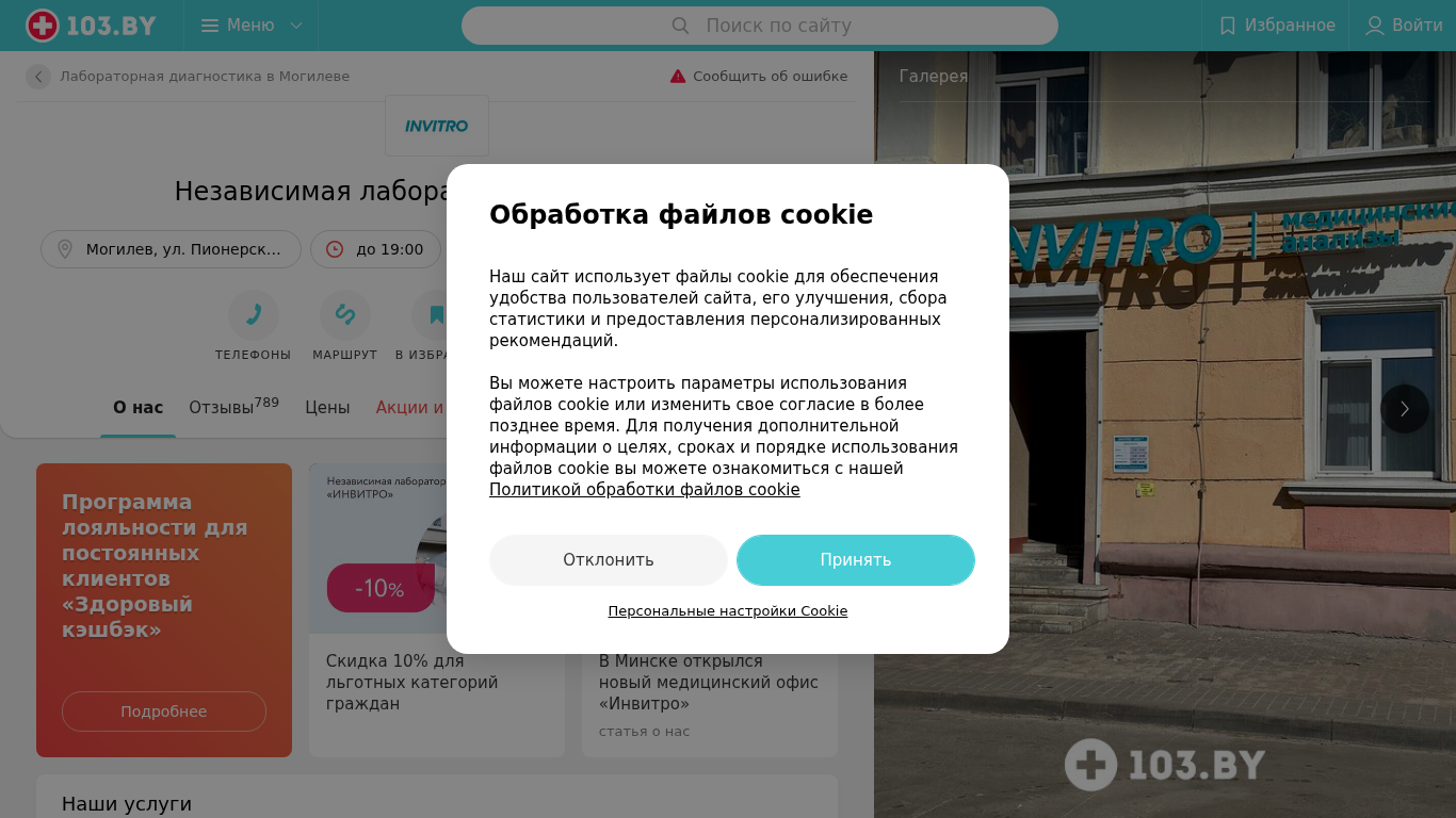 | SEO-описание | Независимая лаборатория ИНВИТРО Могилев ул. Пионерская 29 – телефоны, время работы, отзывы и схема проезда в каталоге медицинского портала 103.by. |
