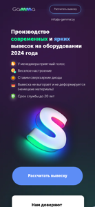 | AI-анализ | --- The web project "s-gamma.by" is a custom signage and LED display manufacturing company based in Belarus. The website offers consultation services and provides clients with the opportunity to calculate the cost of their desired signage project, selecting various sizes and materials, ranging from standard signs to large-scale, three-meter long neon displays. The company specializes in the production of modern, bright LED displays using 2024 equipment and offers a wide range of services including, but not limited to, light boxes, pillars, and stalls. Clients can request a design mockup free of charge and receive a consultation by contacting the company through various means such as Telegram, Viber, or by phone. The company guarantees high-quality, long-lasting displays made from durable German materials and boasts a portfolio of satisfied clients and positive reviews. The website is user-friendly and allows clients |