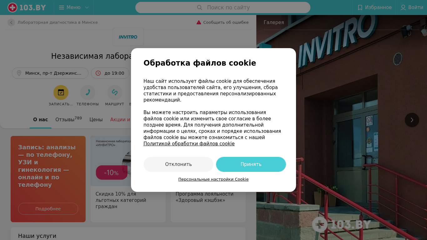 | SEO-описание | Независимая лаборатория ИНВИТРО Минск пр-т Дзержинского 123 – телефоны, время работы, отзывы и схема проезда в каталоге медицинского портала 103.by. |