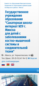 | AI-анализ | The web project "Sanaторная shkola-internat №9 g. Minska (Sanatorial School-Internat No. 9 in Minsk)" is a state educational institution for children with diseases of the skeletal and connective tissue system, located in Minsk, Belarus. The website provides information about the school's administration, educational programs, rules and regulations, contacts, and various documents. It also features a journal for parents, health and wellness resources, and a media library. The school is under the jurisdiction of the Minsk City Education Committee, and its mission is to provide quality education and care for children with specific health needs. The website is available in both Russian and English languages. |