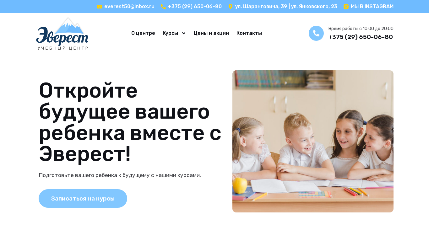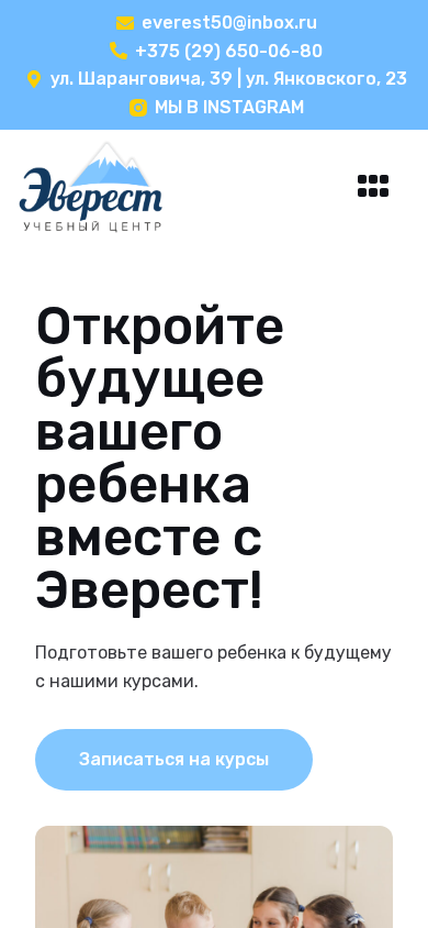 | AI-анализ | The portal Everest is an educational center offering various courses for schoolchildren. The title of the website is "Эверест" and the description mentions "Курсы" (courses) several times, indicating the primary focus of the website. The top_words data shows that the most frequently used words on the site are "курсы" (courses), "очень" (very), "английского" (English), "языка" (language), "компьютерные" (computer), "уже" (already), "занятия" (lessons), "эверест", "спасибо" (thank you), "года" (years), "ребенок" (child), "цены" (prices), "год" (year), "продленки" (extensions), "робототехника |