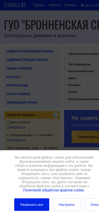 | AI-анализ | --- This website is for Bronnenskaia Srednaya Shkola (Bronnenskaia Middle School) in Rechitskogo Rayon (district). It uses cookies for site functionality and data collection and analysis. Users can allow or manage cookies individually. The site's color scheme is white and the images are turned off in black and white. The school's title and some keywords are provided in the Russian language. The top words on the site include 'cookie', 'файлов', 'работы', 'сайта', 'профилактика', 'подробнее', 'тут', 'сентября', 'нет', 'комментариев', 'образования', 'файлы', 'график', 'все', 'расписание', '2025', 'код', 'новикова', and 'школа |