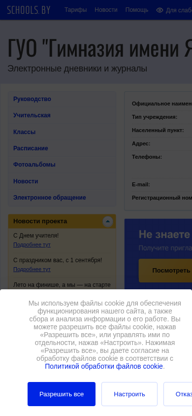 | AI-анализ | --- This website belongs to the educational institution named "ГУО 'Гимназия имени Я. Купалы'" in Belarus. The title of the webpage is "ГУО 'Гимназия имени Я. Купалы'" and its description contains keywords related to education, school, and cookies. The top words on the website include 'образования' (education), 'гимназии' (school), 'cookie', 'имени' (of), 'купалы' (Ya. Kupala), 'работы' (work), 'учащихся' (pupils), '2025', 'правила', 'профилактика', 'файлов', 'сайта', 'общего' (common), 'среднего' (middle), 'учителей' (teachers), |