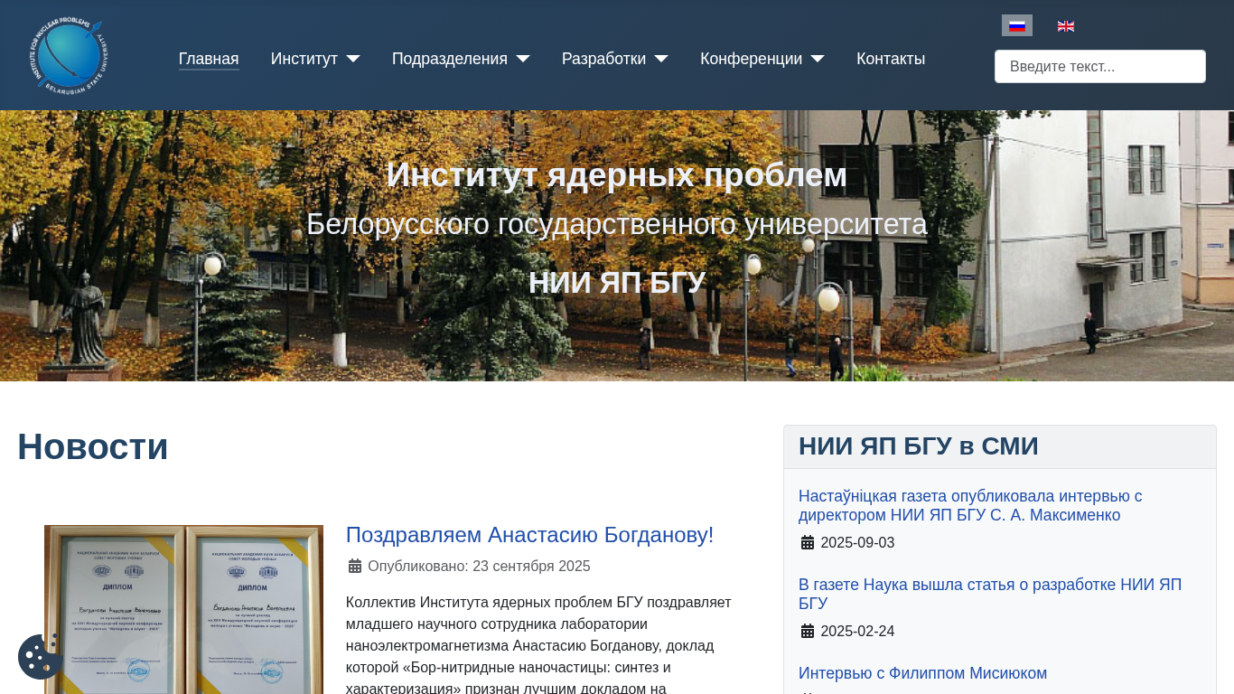 | AI-анализ | --- The portal inp.bsu.by is the official website of the Belarusian State University's Institute of Nuclear Problems (NII ЯП БГУ). It provides information about the institute's administration, research departments, laboratories, ongoing projects, and publications. The institute focuses on fundamental and applied research in various fields of physics, including nuclear physics, theoretical physics, and materials science. Notable areas of study include the physics of high energy densities, nanomagnetism, and analytical research. The website also features information on the institute's scientific achievements, conferences, and contact details. The latest news includes congratulations to a young scientist, Anastasiya Bogdanova, for her award-winning presentation at the 'Molodezh' v nauke – 2025' conference, and an interview with the institute' |