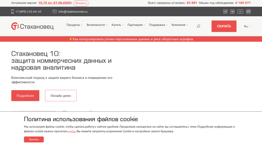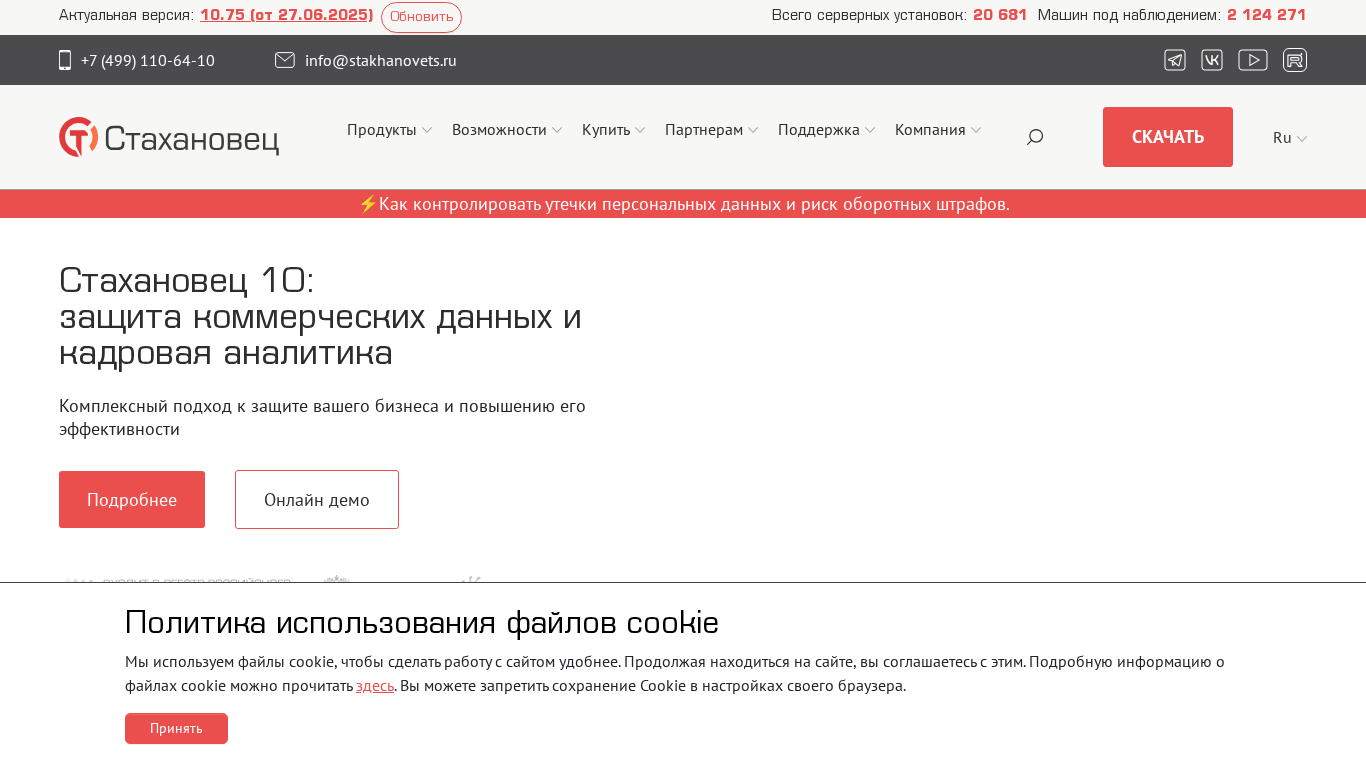 | AI-анализ | --- The web project "Программные средства защиты информации | Стахановец" (Information Security Tools | Stakhanovets) is a Russian software solution designed to ensure data protection, leak prevention, and incident investigation, as well as employee time tracking and personnel analysis. The software offers products such as "Full Control Quantum APS Stakhanovets," which includes Data Loss Prevention (DLP), insider risk management, data protection, employee monitoring, and time tracking features. The software also offers anti-photo capabilities, technical possibilities, and various add-ons. The website provides online demonstrations and system requirements information. The company also offers support, licensing information, and partnership opportunities. The domain is currently on version 10.75, as of June 27, 2025, with 20,681 server installations and |