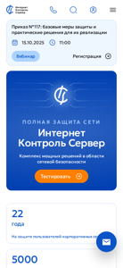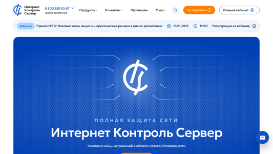 This website is a Russian corporate network protector named IKS, offering Internet Control Server and various security modules for businesses and government entities. The website features products like NGFW IKS, Mezhseteвой экран IKS, and PAK IKS, along with Kaspersky modules for network protection, a web filter, and a category traffic module. It also offers testing, customer reviews, webinars, and technical support. The IKS solutions are certified by FSTEK and provide comprehensive security for networks and data. The website is available in Russian and Belarusian languages.