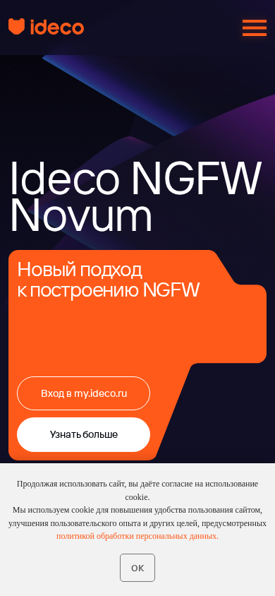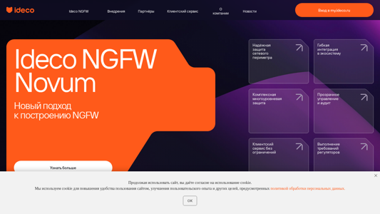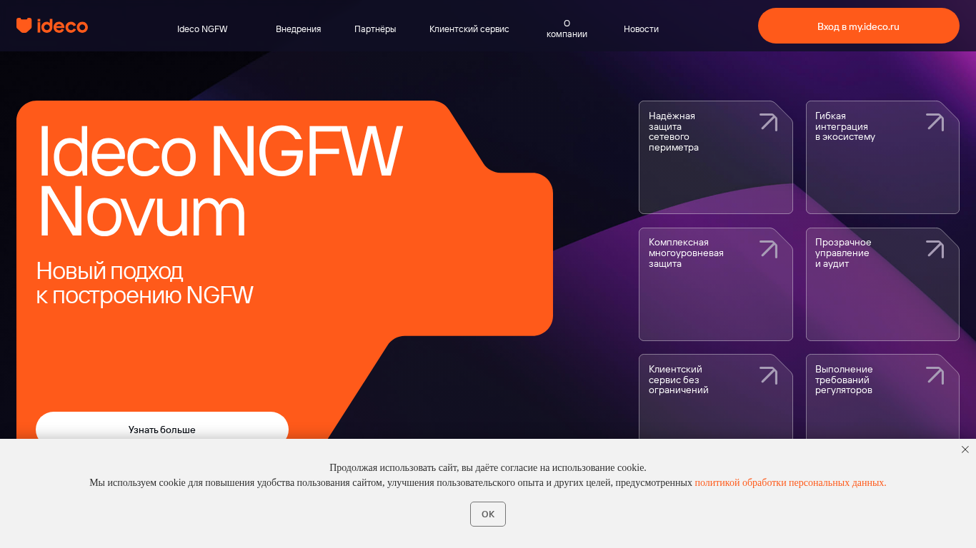 | AI-анализ | This website is the main page of Ideco, a Belarusian company offering network security solutions. The title of the page is "Ideco — Главная" and it contains keywords related to network security, such as "NGFW," "DNS Security," "IPS/IDS," "WAF," and "VPN." The description mentions partnerships, client services, company information, and news, among other things. The top words include "поле," which translates to "field," and "заполнено," which translates to "filled," suggesting that users might be able to input data into various fields on the site. The website also offers a login to "my.ideco.ru." The company's solutions include Ideco NGFW, Novum, and FSТЭК, and it claims to provide reliable security for network perimeters, with support for various technologies such as |