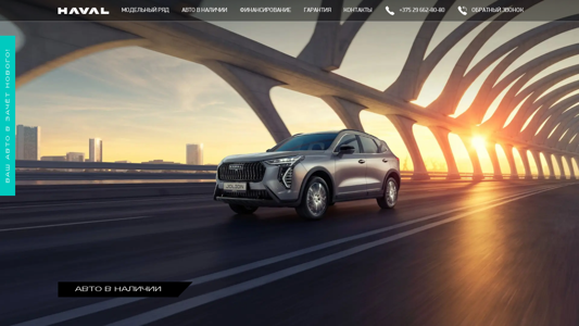 | AI-анализ | This online resource is a website for an auto dealership in Gomel, Belarus, selling new Havals. The dealership offers vehicles with warranties, ozone-coated bodies, advanced safety systems, and richly equipped base models. Customers can purchase a variety of models including the HAVAL F7, JOLION, M6, DARGO, and Poer Kingkong, all with different price points. The website also features information on available financing, contact details, and a call-back request form. Havals have been available in Belarus for over 17 years, with a strong reputation for reliable sales and after-sales support, as well as a secondary market. In 2023, HAVAL ranked third in Belarusian light vehicle sales (according to the Belarusian Automobile Association). The success is attributed to quick car deliveries and stable |