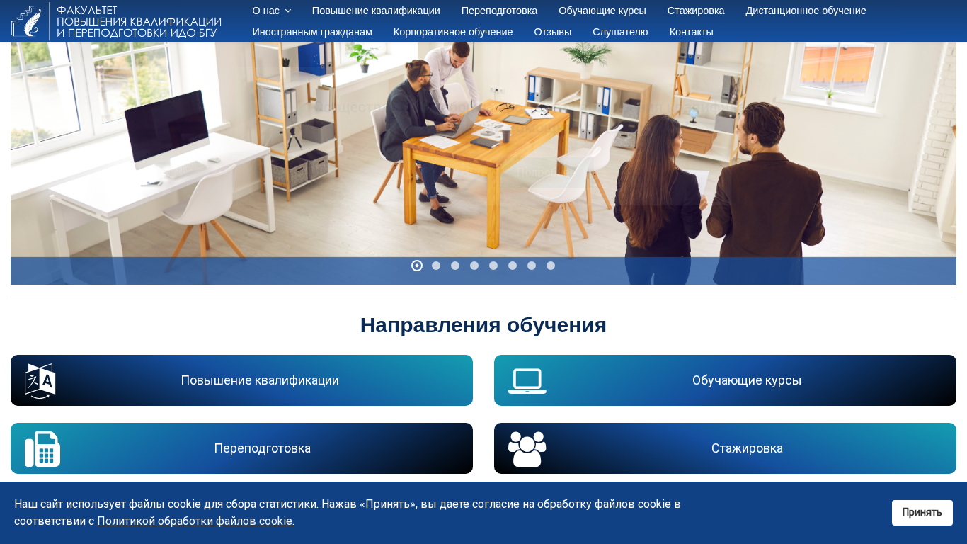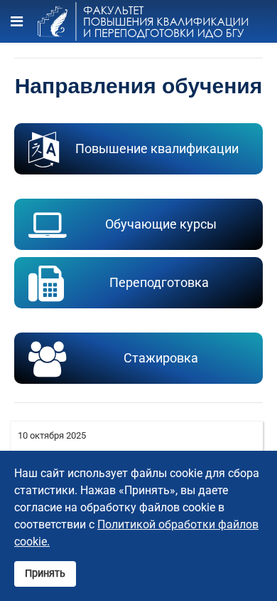 | AI-анализ | This website is for the Faculty of Further Education and Professional Development at BSU (Belarusian State University). The title is 'Факультет повышения квалификации и переподготовки' in Russian. The description mentions the faculty's mission to provide qualification enhancement and professional development. Key topics include training programs, enrollment, and various courses for improvement. The top words indicate a focus on qualifications, enrollment, and detailed information. There are sections for staff information, documents, a unified day of information, and various training programs such as 'Effective Assistant to a Manager', 'Media Mastery', and 'Modern Trends in Management'. The faculty offers corporate training and distance learning opportunities. There are also sections for reviews from attendees and contact information. The faculty has participated in international forums and completed training programs for National Bank of Belarus staff. The |