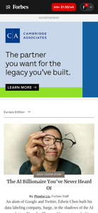 | AI-анализ | language: en The portal Forbes is a global media company that covers various topics including business, technology, leadership, entrepreneurship, and lifestyle. The website is rich in content, featuring newsletters, games, a news tip submission form, and numerous lists such as "The Cloud 100 List," "America's Top Next-Gen Wealth Advisors," and "Forbes 400." The description also indicates the presence of paid programs, suggesting that the portal generates revenue through advertising or sponsored content. The top keywords associated with the website are "forbes," "business," "tech," "leadership," "entrepreneurs," and "investing," reflecting its primary focus on these areas. The website is available in English (en) and is the main domain for Forbes, with the domain being forbes.com. |