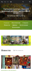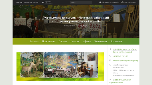 | AI-анализ | The web project "Чаусский районный историко-краеведческий музей" (Chaussky Railayonny Historiko-Kraevedcheskiy Museum) is a cultural institution website providing news and event information, visitor details, prices, exhibitions, collections, and materials for museum professionals. The site features news articles such as "Картины в дар музею!!! 12.08.2025" and "Чаусскому музею — 35 лет 28.05.2025", as well as information for visitors including opening hours, Monday being the day off. The museum shop is also accessible through the site. The site is developed by the scientific-informational department of NPIKMZ, Dekart.org, the portal of the President of Belarus, the Ministry |