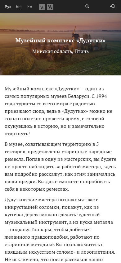 | AI-анализ | --- The web project "Museum Complex 'Dudutki'" offers news and event schedules, visitor information, prices, exhibitions, collections, and materials for museum professionals. The popular museum in Belarus, established in 1994, attracts tourists worldwide. With a five-hectare area, this museum showcases traditional folk crafts. Visitors can learn about the techniques behind these crafts from skilled artisans and even try their hand at some. Ink-making, wooden instrument creation, metalworking, pottery, weaving, baking, and brewing are some of the crafts presented. The museum also features a zoo with various animals, a horse riding area, and an auto-retro workshop with vintage vehicles. Guided tours are available in Russian, English, and Belarusian. |