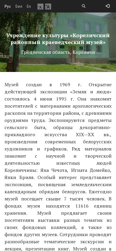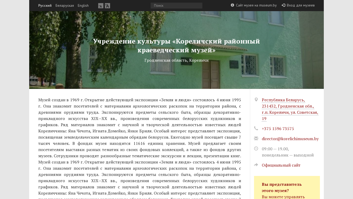 | SEO-описание | Учреждение культуры «Кореличский районный краеведческий музей» — новости и афиша мероприятий, информация для посетителей, цены, экспозиция, коллекции, материалы для музейщиков. |