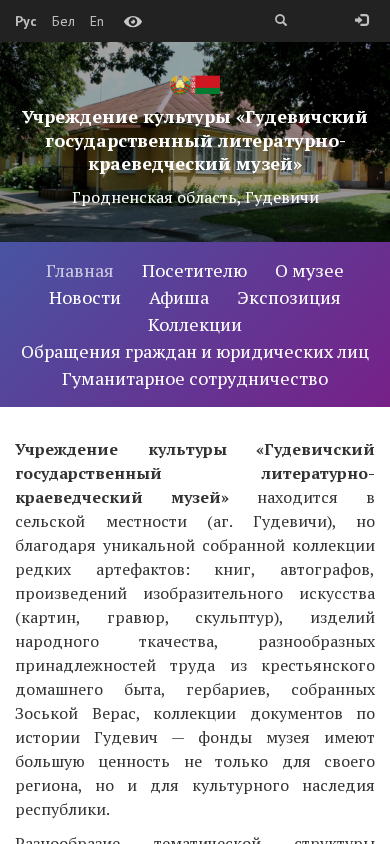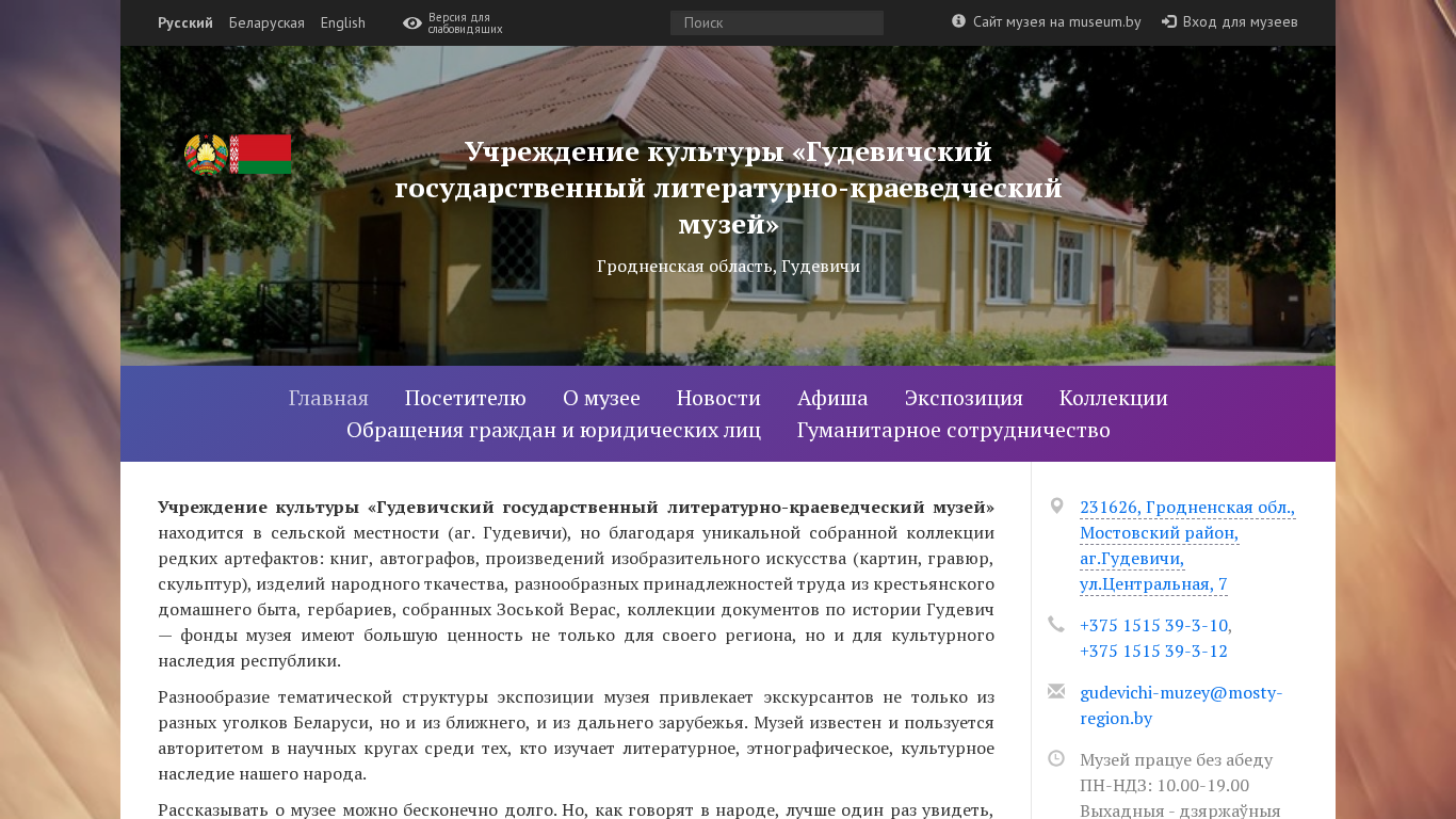 | SEO-описание | Учреждение культуры «Гудевичский государственный литературно-краеведческий музей» — новости и афиша мероприятий, информация для посетителей, цены, экспозиция, коллекции, материалы для музейщиков. |