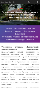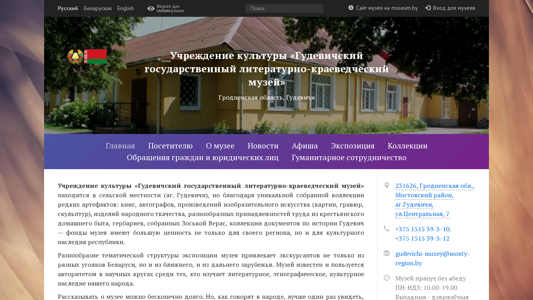 | AI-анализ | The website is for the "Gudevich State Literary and Folklore Museum" in Belarus. It provides news and event schedules, information for visitors, admission prices, exhibition details, collections, and resources for museum professionals. |