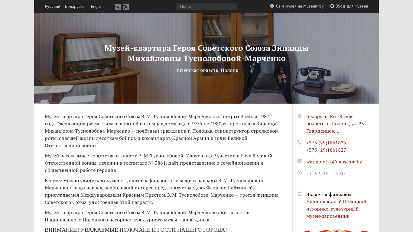 | SEO-описание | Музей-квартира Героя Советского Союза Зинаиды Михайловны Туснолобовой-Марченко — новости и афиша мероприятий, информация для посетителей, цены, экспозиция, коллекции, материалы для музейщиков. |