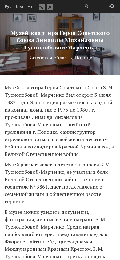 | AI-анализ | The website is a museum dedicated to Hero of the Soviet Union Zinaida Mikhailovna Tusnolobova-Marchuk. It provides news and event information, visitor information, prices, exhibitions, collections, and materials for museum professionals. The site includes a search function for the museum on museum.by, an entrance for museums, and information about the museum-apartment located in the Vitsebskaya oblast, Polotsk. The museum-apartment of Hero of the Soviet Union Z. M. Tusnolobova-Marchuk was opened on July 3, 1987. The exhibition is housed in one of the rooms of her former residence, where she lived from 1975 to 1980. Zinaida Mikhailovna Tusnolobova-Marchuk was a Red Army sanitarian who |