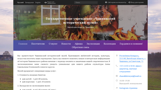 The portal Chasniki.museum.by is the official website of the State Institution "Chashnik Historical Museum." It provides news and event schedules, information for visitors, admission prices, exhibition details, collections, and materials for museum professionals.