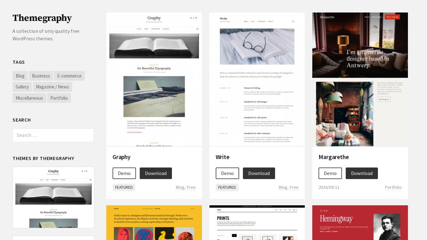 | AI-анализ | This website, titled "Best WordPress Themes - Themegraphy," offers a collection of free and premium WordPress themes, with a focus on quality. The site includes various tags such as blog, business, e-commerce, free, and portfolio, and features a search function for users to find themes by category. The homepage displays several featured themes with the option to download demos. The site is available in English and offers contact information and a demo option for users. |