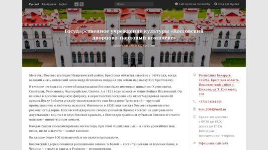 | SEO-описание | Государственное учреждение культуры «Коссовский дворцово-парковый комплекс» — новости и афиша мероприятий, информация для посетителей, цены, экспозиция, коллекции, материалы для музейщиков. |