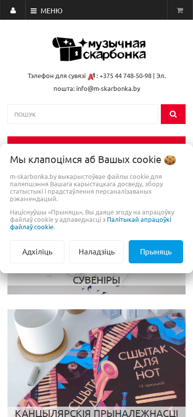 | AI-анализ | This website, titled "Музычная скарбонка - тавары для музыкантаў" (Musician's Treasure - Goods for Musicians and Vendors in Belarus), offers various products for musicians and vendors from Belarus. The inventory includes trainers, gifts, souvenirs, posters, and musical instruments. The top words in the text indicate a focus on musical instruments, musical theory, and accessories, with significant mentions of trainers, posters, and souvenirs. The website also features a shopping cart, a contact email, and a telephone number for customer inquiries. Categories in the menu include "Suveniary Musical Instruments," "Souvenirs," "Lesson Supplies," "Music Theory," and "Musical Instruments." The website sells Belarusian folk musical instruments and other musical instruments |