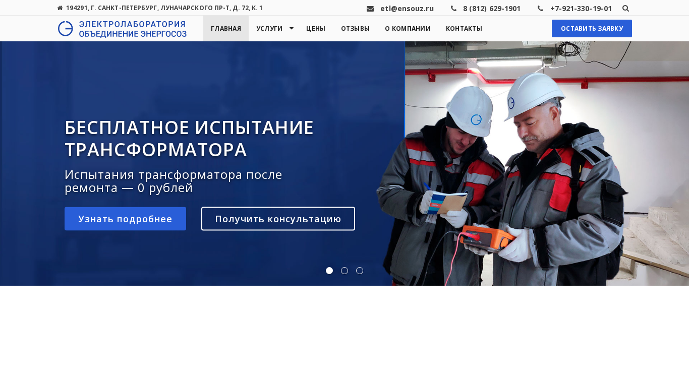 | Название / Заголовок | ООО "Электролаборатория "Объединение Энергосоюз" * Приемосдаточные и периодические испытания и измерения, наладка РЗиА: электрические сети, трансформаторные подстанции, распределительные устройства и электрооборудование промышленных предприятий. |