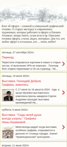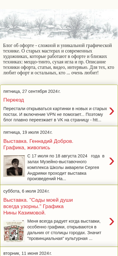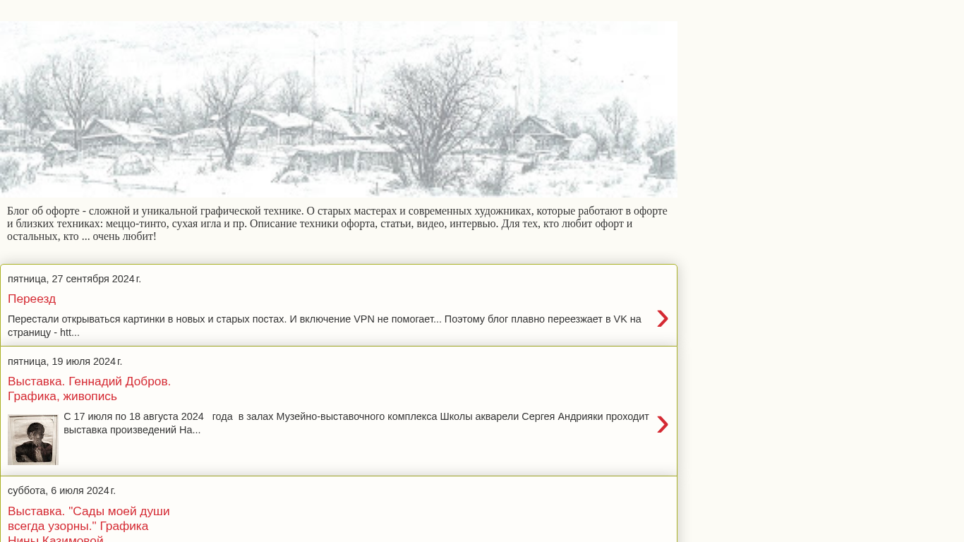 | AI-анализ | This website is a blog dedicated to the complex and unique graphic technique of printmaking called offset lithography, or oфорt in Russian. The blog covers the history, people, and events related to this technique and similar ones such as mezzotint, drypoint, and others. It includes articles, videos, and interviews for those who love printmaking and others who are interested. The website has undergone a transition to the VK social media platform due to issues with displaying images in new and old posts, and can be found at htt[...]. The blog features news and information about various exhibitions, such as a show by Gennady Dobrov from July 17 to August 18, 2024, and an exhibition of Nina Kazimova's graphics titled "Sady moей duši vsegda uzorny" from June 6, 202 |