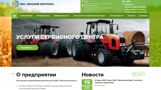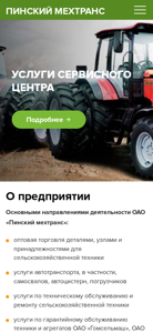 | AI-анализ | --- The web project "Пинский мехтранс.by" is a website for OAO "Пинский мехтранс," a Belarusian enterprise based in Pinsk, Brest Oblast. The company specializes in the trade and production of agricultural machinery, offering services such as repairs, maintenance, and import of technical equipment. Visitors can find information about the company's history, quality, awards, vacancies, social responsibility, and anti-corruption initiatives. The website also includes a photo gallery, service and technical centers, and contact information, including local phone numbers. The main product categories include machinery for livestock farming and agricultural equipment for import. The website is available in both Russian and Belarusian languages. |