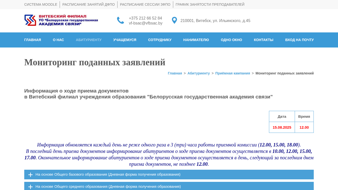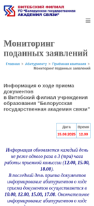| AI-анализ | The website monitor.vfbsac.by is dedicated to managing applications for a specific educational institution. The title of the website is "Мониторинг поданных заявлений" (Monitoring Applications), and the description includes various keywords related to applications, specialties, and admissions. The website provides information about the institution's history, administration, structures, resources, and facilities, including a virtual tour of the campus and academic buildings. It also offers information on tuition fees, housing for students, and contact details. The website uses Moodle for scheduling classes and managing student information. The domain is registered to the Vitsebsk State Agricultural College (VFBSAC) located in Vitsebsk, Belarus. |