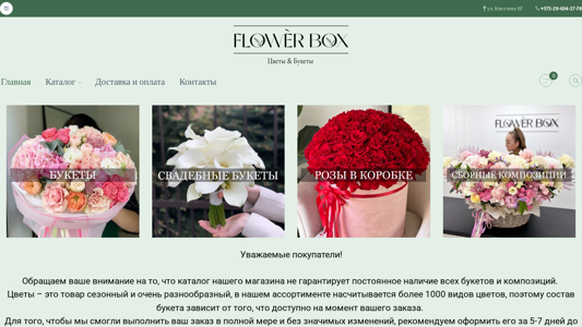 SEO-описание | Цветочный магазин 🌸Flowerbox🌸 предлагает купить цветы в Минске.🌹 Быстрая доставка. 🌷 Современная флористика! 💐 Скидки постоянным покупателям! |