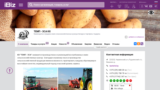 | Название / Заголовок | ТЕМП - ЗСА КХ - Производство и продажа семян сельскохозяйственных культур в Беларуси. Картофель. Сидераты.. 223232, , Руднянский с/с, Вишенка д. |