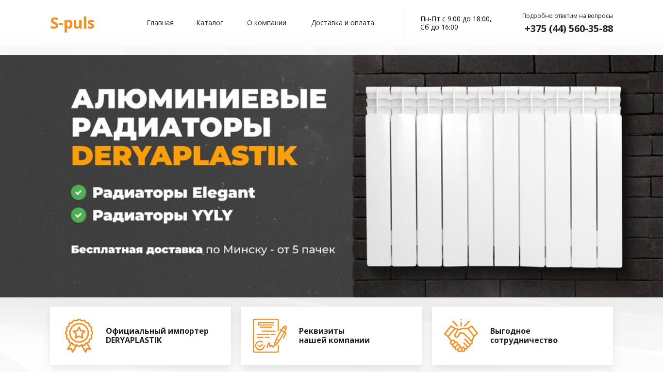 | SEO-описание | Алюминиевые радиаторы отопления покупайте оптом в S-puls — импортер компании DERÝAPLASTIK из Туркменистана в Республику Беларусь. Бесплатная доставка по всей Беларуси |