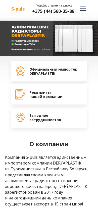 | AI-анализ | --- The portal s-puls.by is an e-commerce platform importing aluminum radiators for heating from the company DERÝAPLASTIK in Turkmenistan to Belarus. It offers free delivery across Belarus and sells radiators in bulk. The website provides detailed information about the company, its partnership with DERÝAPLASTIK, and its products, including aluminum radiators. These radiators are known for their efficient heat distribution and suitability for various applications, from residential to industrial settings. The compact and elegant design is a popular choice for modern interiors. S-puls prides itself on offering cutting-edge technology, attractive design, and reliable performance in its products. Their team of experts is available to provide consultations and assist in selecting the optimal solution for heating needs. S-puls offers a range of aluminum radiators, including the YYLY 50 |