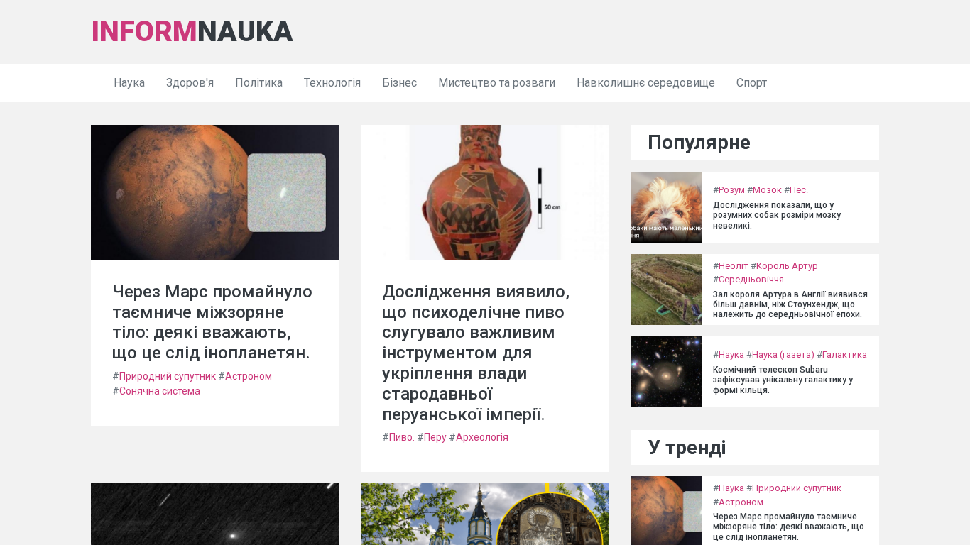 | AI-анализ | The website informnauka.com is a science news platform, as indicated by its title "Новини зі світу науки" and description "Найсвіжіші та найцікавіші новини науки." The keywords and top_words suggest a focus on various scientific fields, including astronomy, archaeology, geology, and technology. Some articles cover recent discoveries, such as a potentially alien object and an ancient Peruvian brew, while others discuss ongoing research and scientific events. The website also provides information about scientific conferences and Nobel Prize winners. The content is presented in a newspaper format, with articles categorized under topics like "Наука," "Здоров'я," "Політика," and "Технологія." |