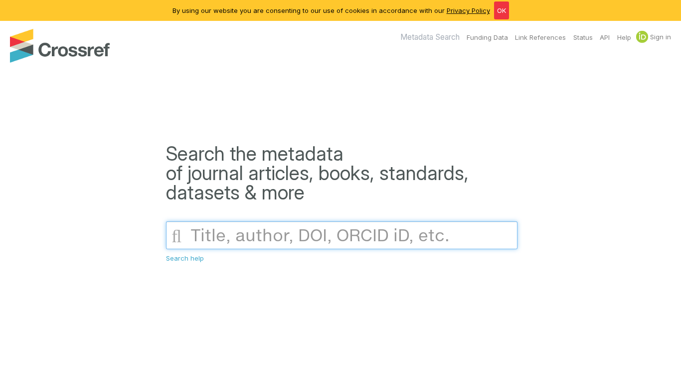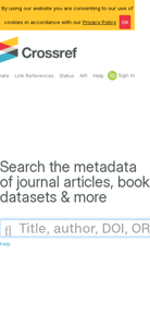| AI-анализ | This online resource, titled "Crossref Metadata Search," offers a search engine for metadata of scholarly publications, including journal articles, books, standards, and datasets. Users can search for specific information using keywords or topics, such as "search," "metadata," or "our help." The website also provides links to related funding data and APIs for developers. To access the service, users must first consent to the use of cookies in accordance with the website's privacy policy. The domain for this resource is "search.crossref.org." |