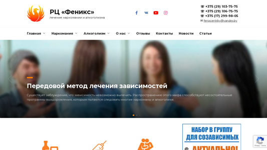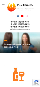 --- The web project "Реабилитация наркоманов и алкоголиков (рехаб) | РЦ «Феникс»" is a rehabilitation center for drug addicts and alcoholics located in Minsk, Belarus. The title and description of the website indicate that the center offers effective treatment for various forms of addiction, including those to Spice, solvents, marijuana seeds, methadone, and heroin, as well as alcoholism. The keywords "лечение" (treatment) and "зависимости" (dependencies) are the most frequently used words on the site. The center also mentions treatment for specific drugs, such as Spice, solvents, marijuana seeds, methadone, and mefeдрона (a synthetic drug), and various types of alcoholism, including social and women's alcohol