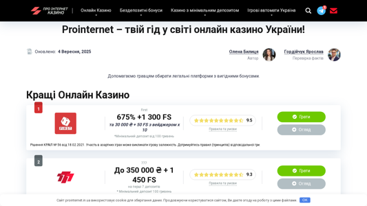 | AI-анализ | The portal Prointernet.in.ua is a Ukrainian online casino review website, focusing on reliable evaluations of online casinos for Ukrainian players. It provides information on licensed operators and offers the most advantageous bonuses for newcomers. Keywords: casino, best, Ukraine, bonuses, gaming, online. Top words: casino (131), licence (54), Ukraine (45), bonuses (43), gaming (41), online (34). The website features sections on new Ukrainian casinos, casinos without verification, live casinos, mobile casinos, casinos with minimum deposits, foreign casinos, casinos for those aged 18 and above, no deposit bonuses, free spins, cashback bonuses, and various casino games including slots with high yields, new slots, and popular slots. The authors of the content are Olena Bilits |