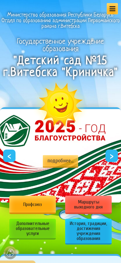 | AI-анализ | The website is for the Children's Garden Number 15 in the city of Vitebsk, Belarus, named "Krinicka". The site provides information about the structure and working hours of the kindergarten, as well as administrative procedures and normative documents. Users can find details about the management team, licensing information, pedagogical staff, and age groups. The website also features news, health and safety measures, and information on enrollment and termination of educational relationships. Additionally, it covers anti-corruption efforts, the history and achievements of the kindergarten, and various educational and support services for children and parents. The domain is part of the educational network in the First of May district of Vitebsk city. |