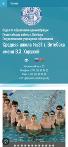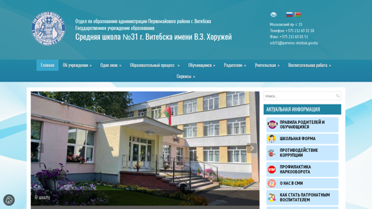 | AI-анализ | The website is for Middle School No. 31 in the city of Vitebsk, Belarus, named after V.Z. Horuzhey. The school is under the administration of the Education Department of the First May District of Vitebsk. The website provides information about the school's goals and objectives, which include the 2025 Year of Country Improvement. The school's leadership, history, achievements, and educational standards are detailed. The website also outlines the organization of the school's access control and green school initiatives. Topics covered include environmental preservation, energy conservation, water conservation, waste management, and air quality. Information on the school's library, accomplishments, and news are also available. The website includes a calendar of significant dates, a self-control policy, licensing information, and various educational policies and procedures. Contact information for the school, including a phone |