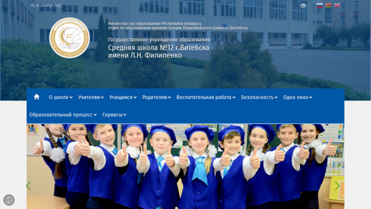 | AI-анализ | The website is for Middle School No.12 in the city of Vitebsk, Belarus, named after L.N. Filippenco. The date mentioned is October 10, 2025. The website supports the Belarusian language and various others including, but not limited to, Azerbaijani, Bengali, Burmese, Cantonese, Danish, Dutch, English, Filipino, German, Gujarati, Hawaiian, Hungarian, Indonesian, Irish, Italian, Japanese, Kannada, Kazakh, Korean, Kurdish, Lao, Latvian, Lithuanian, Maltese, Malay, Marathi, Marwari, Mongolian, Nepali, Nuer, Persian, Polish, Punjabi, Russian, Sanskrit, Santali, Samoan, Sango, |